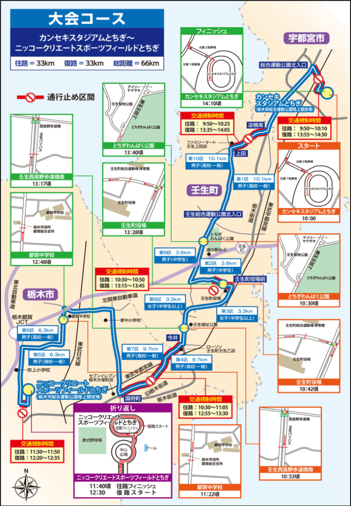 大会当日は、宇都宮市・壬生町・栃木市のコース周辺で交通規制が実施されます。特に中継所付近や主要交差点では一時的な通行止めも予定されているため、お出かけの際はご注意ください。